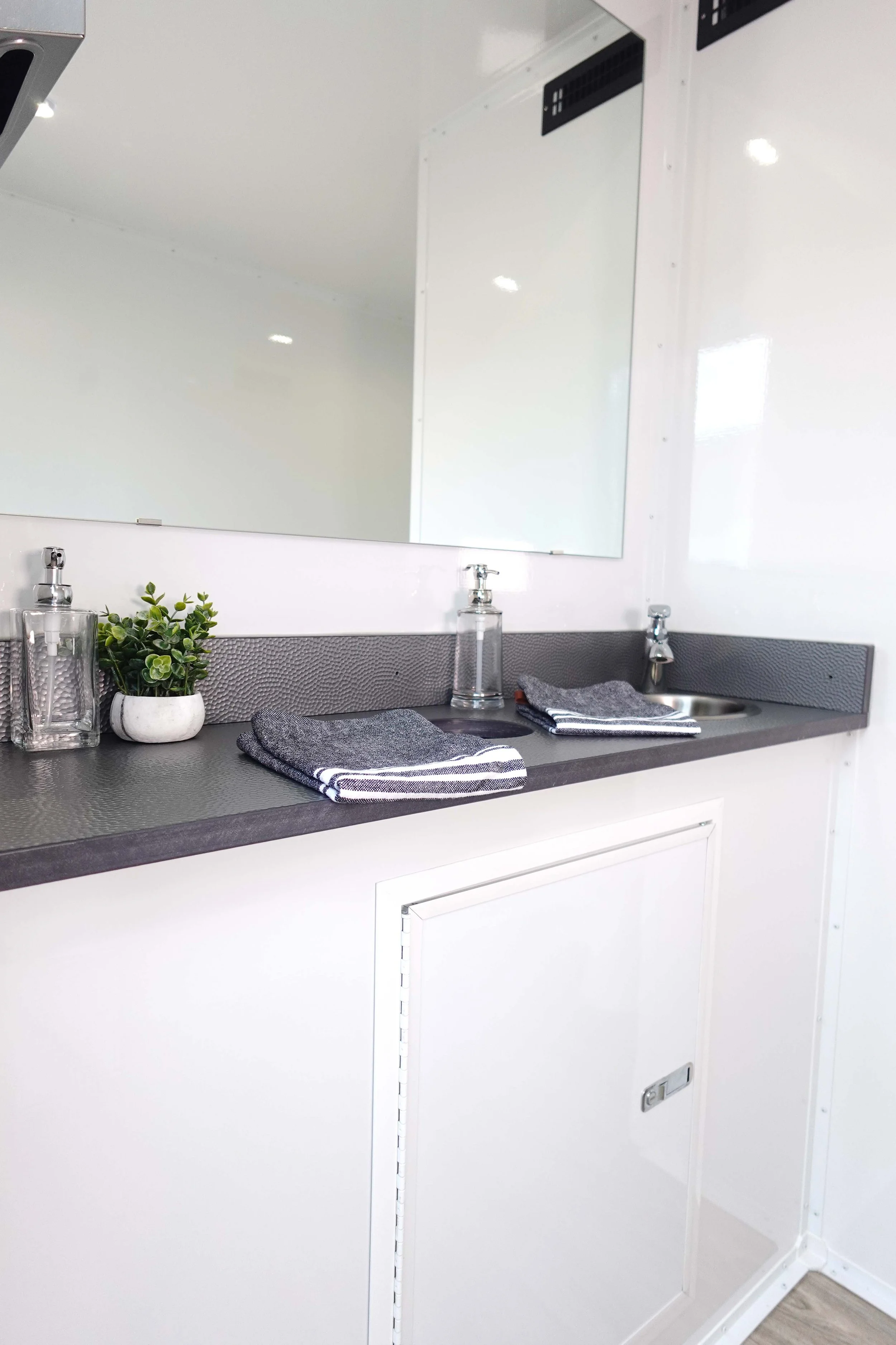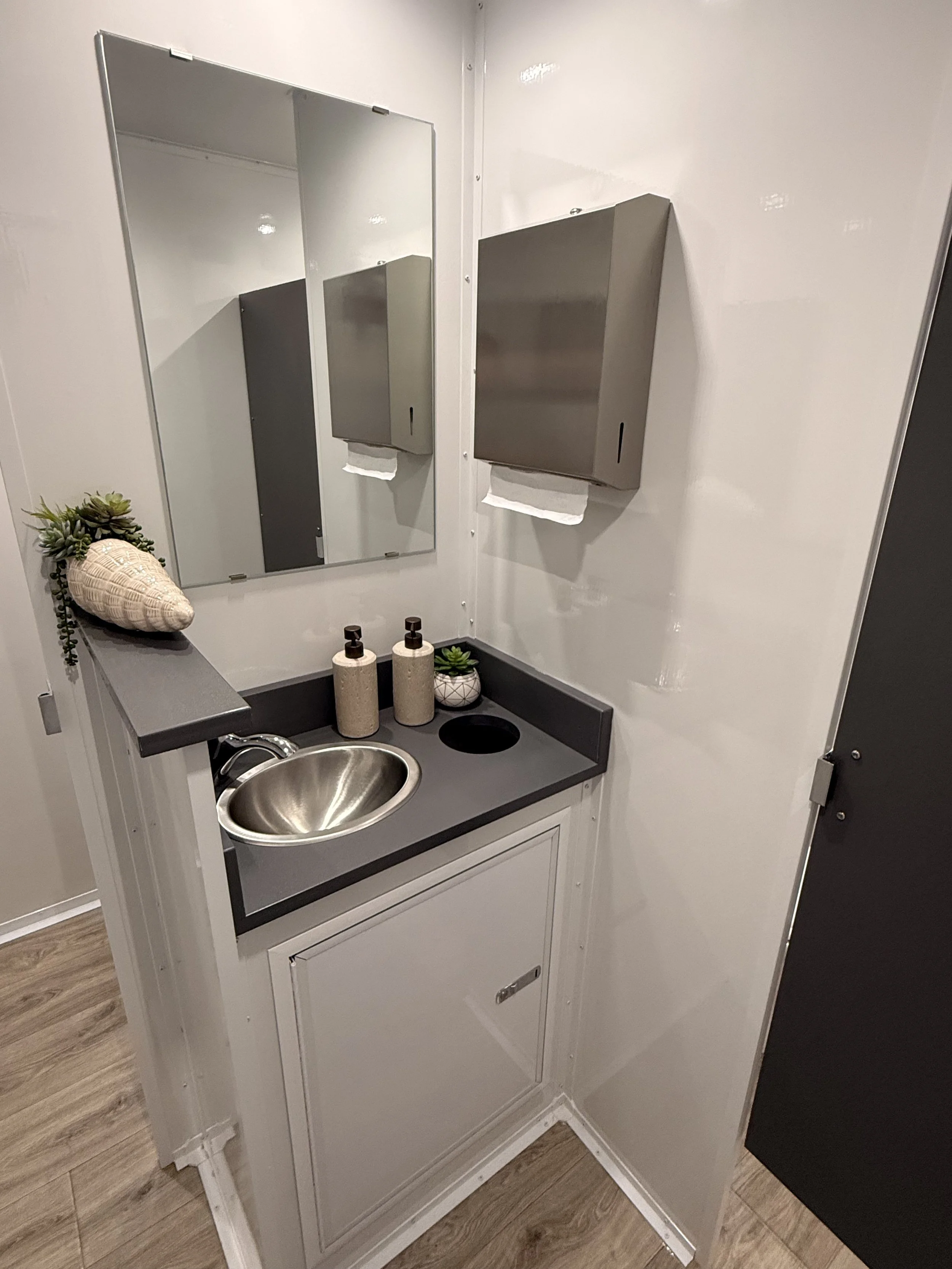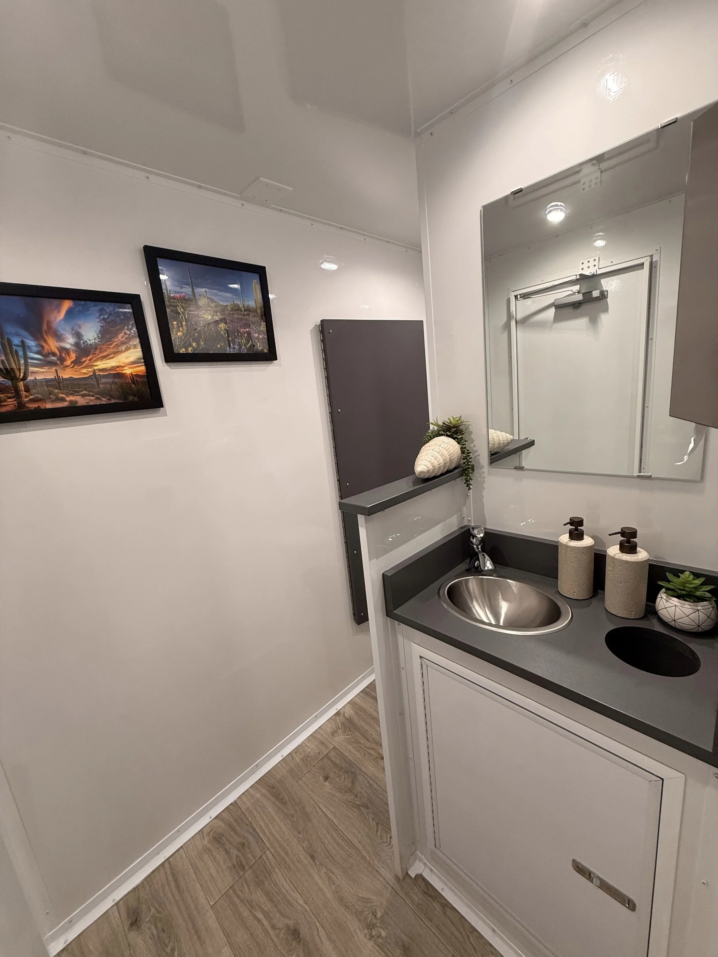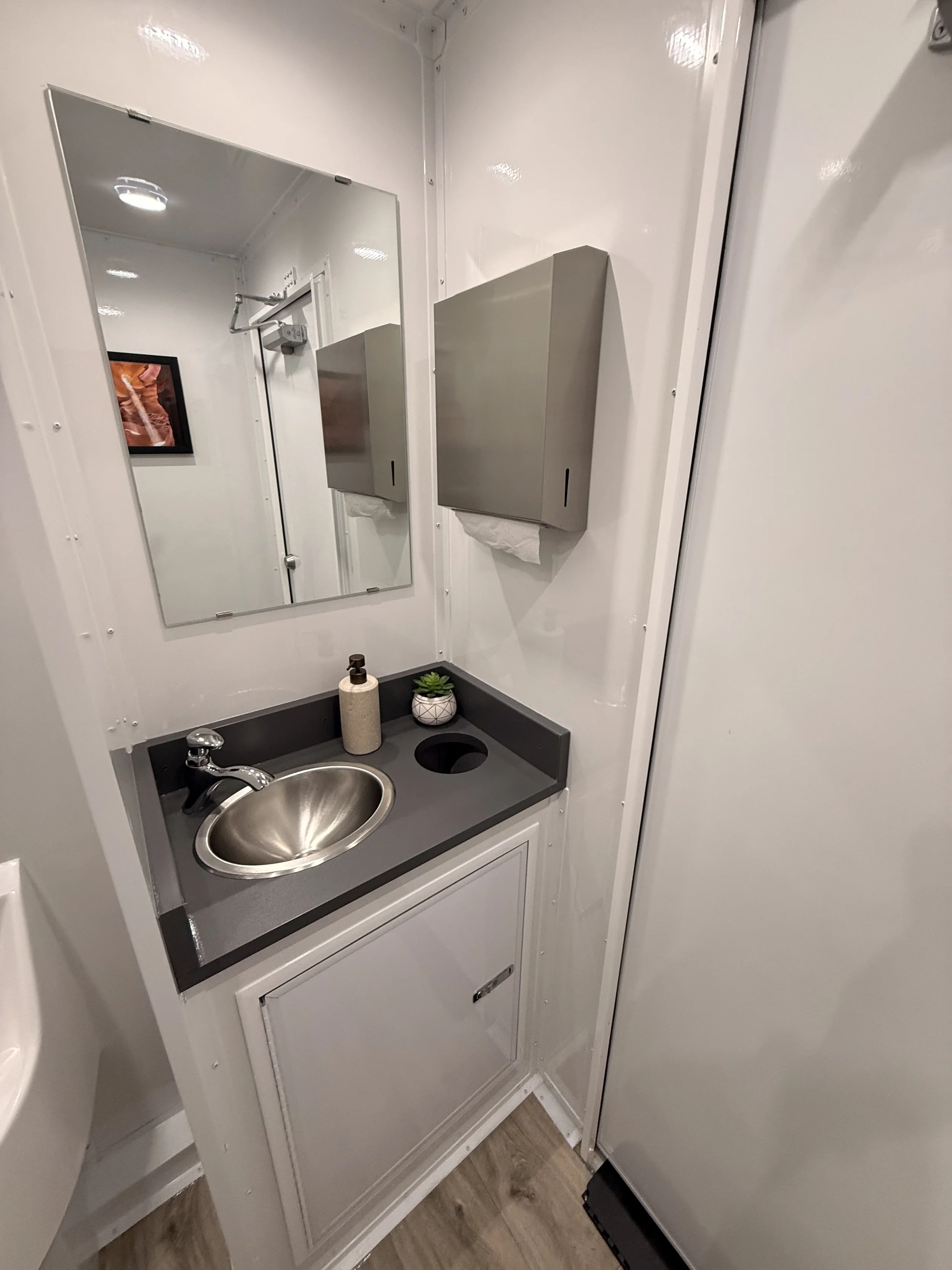 Shared washroom in both the men's and women's rooms, with private stalls and slide-lock doors. The men's room has 1 private flushable toilet and 1 waterless urinal. The women's room has 2 private toilet stalls. Each room has a sink and oversized lockable vanity for a large garbage can. We recommend using this trailer for events that have an expected guest count of 250 people or less over a 5-6 hour event.